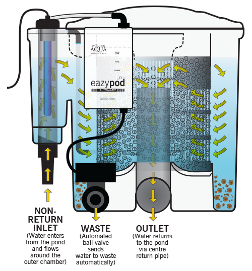 The EazyPod Automatic is an advanced filtration system for garden ponds up to 10,000 liters in volume. This self-cleaning system comprises of a combination of mechanical and biological filtration, utilizing a static bed of K1 Micro media for providing enhanced biological benefits. The filter is equipped with a control box, placed on the side, which contains an adjustable timer for initiating an automated cleaning cycle, even when you are away from the pond. Inside the control box, electronic connector blocks control the automated waste valve, along with the circulating pump (not included) and the integrated air pump kicks in automatically to clean the K1 Micro media. The Eazypod UV Automatic has an additional feature of an integrated 18-Watt UVC in the inlet section of the filter, which helps in clearing green water, making it fully automatic self-cleaning filter.The EazyPod Automatic is capable of achieving crystal clear, healthy water.